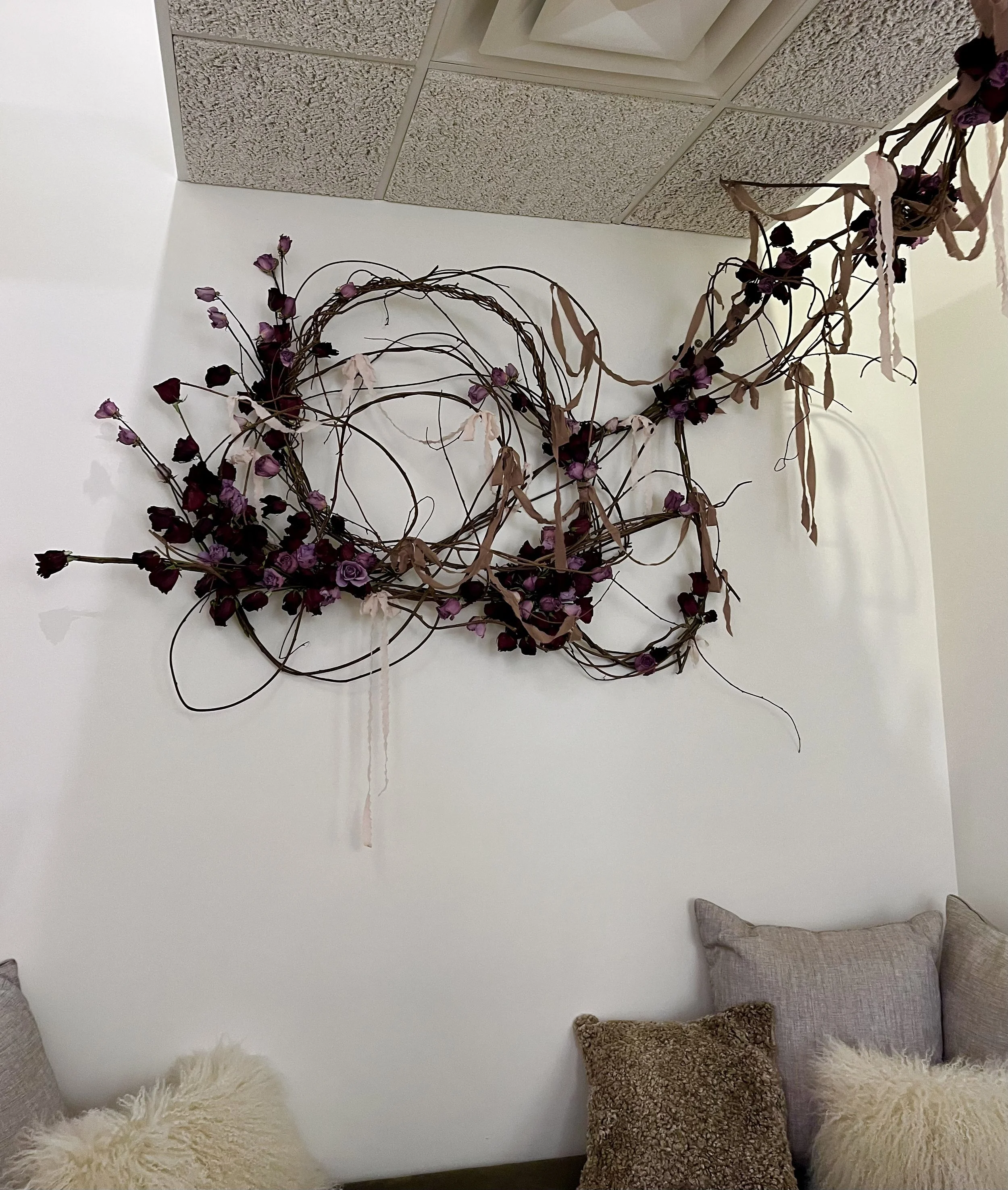 Our interior installations feature a base of vines that can be switched out seasonally. Our holiday greenery included a mass of Maine white pine, accented with specialty greenery and luxe silk ribbon. Our Valentine’s Day-inspired installation featured an abundance of dried roses in lavender and red hues, while allowing the shape and armature of the vines to be a highlight.